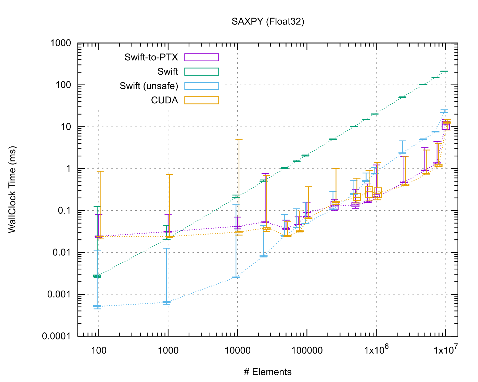 I don't have a comparison to Mojo, but that could be interesting to add. The above benchmarks are so simple I would be surprised if Mojo has much to play with, so I think comparing against CUDA (the implementations are taken from the CUDA samples repo) is a good baseline. It's difficult to really see the differences in the above charts, but once the code is available (real soon now™) you can decide for yourself.