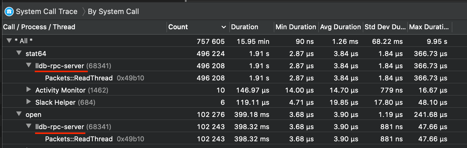 I can see lldb-rpc-server loads a single CPU core (100%). Disk I/O is zero to 50 kilobytes/sec most of the time, 0 to ~20 IOPS in Activity Monitor. Does this sound like file system contention?
