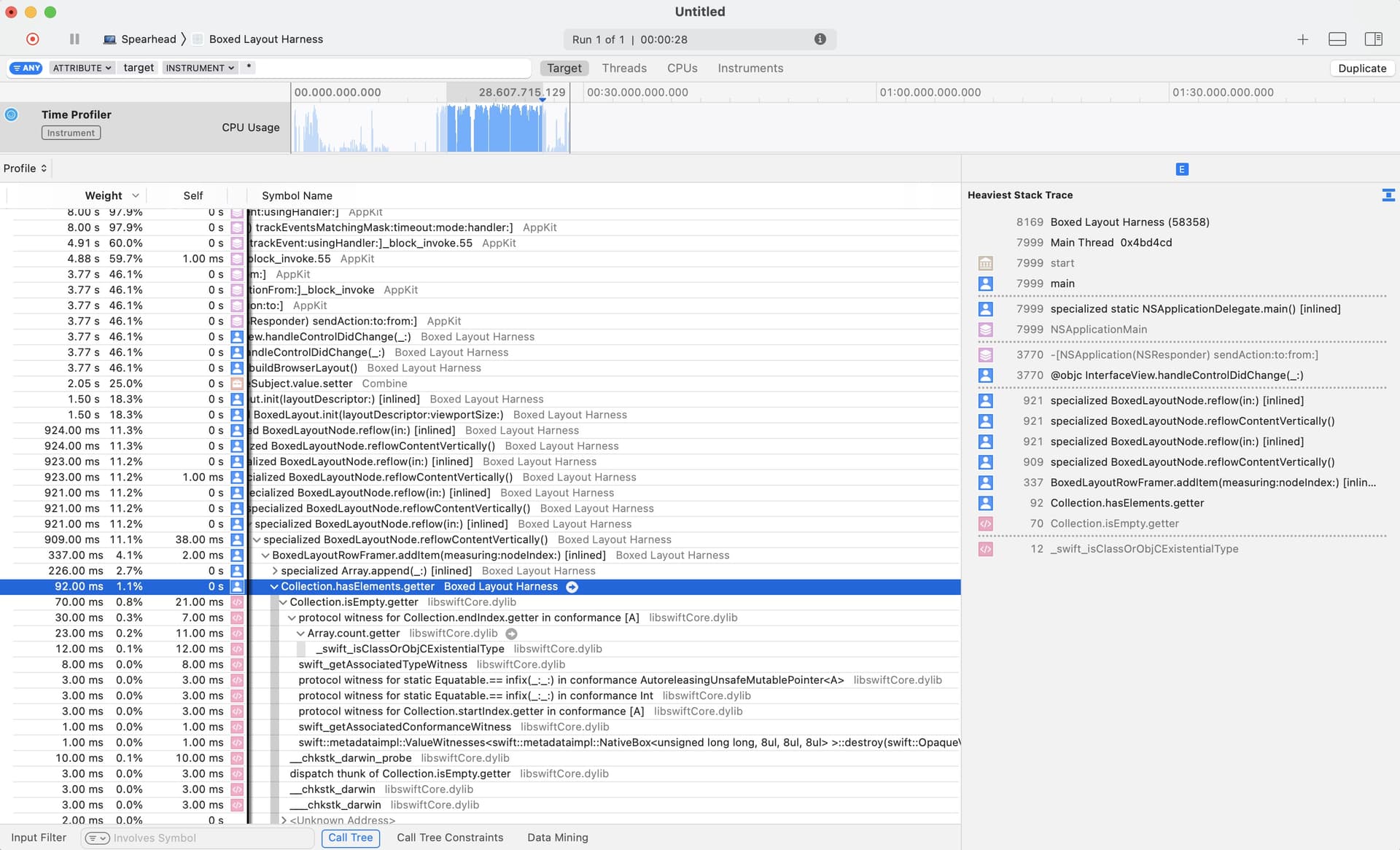 Xcode 13 Beta 5, macOS 12 Beta 21A5506j, Release Build profiled in Instruments.