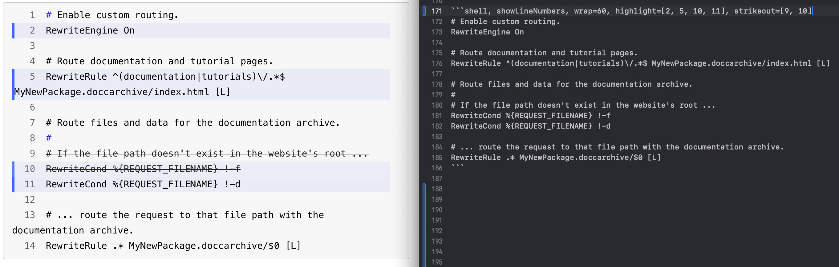 ```shell, showLineNumbers, wrap=60, highlight=[2, 5, 10, 11], strikeout=[9, 10]