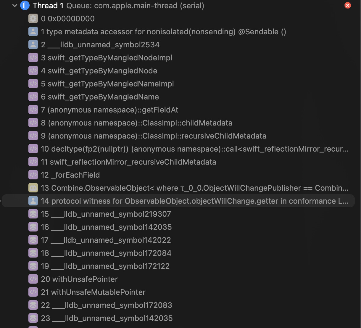 0x1028dd4c4 <+20>: bl 0x1028e25bc ; symbol stub for: Combine.ObservableObject< where τ_0_0.ObjectWillChangePublisher == Combine.ObservableObjectPublisher>.objectWillChange.getter : Combine.ObservableObjectPublisher
